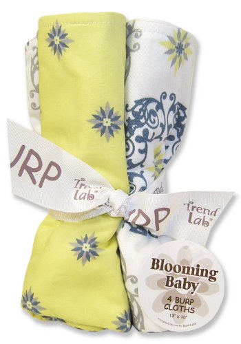 Keep messes to a minimum with this Monaco burp cloth set by Trend Lab. Set features four burp cloths each with fun, modern prints on the front with absorbent terry on the back. Burp cloth patterns include: two medallion print cotton percale and two starburst print cotton percale. Each burp cloth measures 13" x 10".