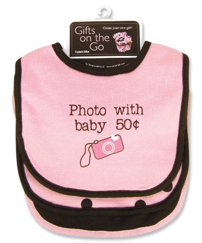 •Set of three coordinating bibs •Pink and brown jersey •Message bib "Photo with Baby 50 Cents" •Each bib is 12" x 8 1/2"