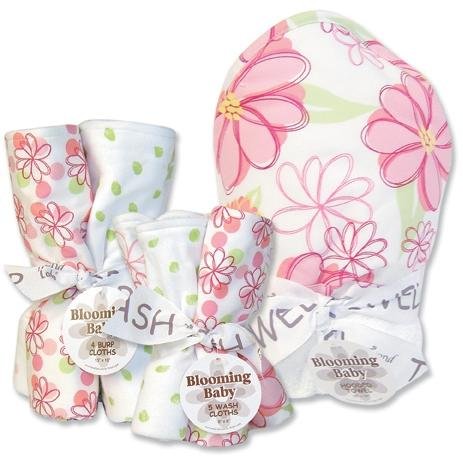 Blooming bouquet 3 pack set is a perfect gift. Contains one hooded towel in hula baby floral print. Towel measures 32" x 30". Wash cloth set is bundle of five and each cloth measures 8" x 8" with fun modern print on one side and terry on the other. Burp cloth set is bundle of four and each cloth measures 13" x 10" and is fun modern print on one side, white terry on the other.